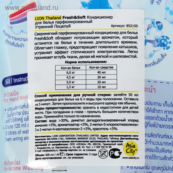 Кондиционер для белья LION THAILAND Fresh&Soft "Утренний Поцелуй" - это выбор тех, кто ценит качество, комфорт и приятные ароматы. Попробуйте его, и вы не останетесь равнодушными!