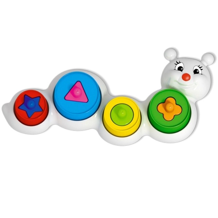 На подставке в форме гусенички находятся 4 круглые площадки разного диаметра, к которым нужно подобрать подходящие разноцветные цилиндрические кольца. У каждого кольца есть геометрическое отверстие для своей фигуры. Таким образом, сортер представляет собой двухэтапную задачу, в которой малыш должен подобрать подходящую фигуру к кольцу и установить каждое кольцо на площадку нужного диаметра. Это способствует развитию у ребёнка логического мышления и сортировочных навыков.