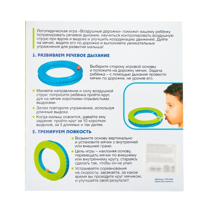 Логопедический тренажёр «Воздушные дорожки» поможет малышу потренировать речевое дыхание, а также научит контролировать воздушную струю при вдохе и выдохе и улучшит координацию движений.