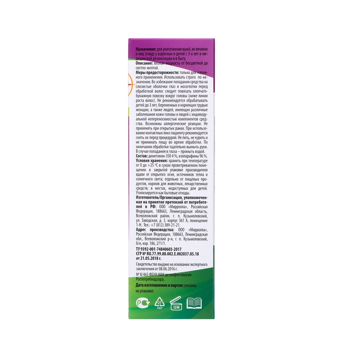 Лосьон содержит специальные ингредиенты, которые помогают уничтожить вшей и гнид. Он безопасен для использования на волосах и коже головы, не вызывает раздражения и не содержит вредных химических веществ.