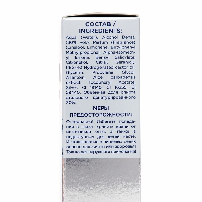 Состав: Aqua (Water), Alcohol Denat. (30% vol.), Parfum (Fragrance) (Linalool, Limonene, Butylphenyl Methylpropional, Alpha-Isomethyl Lonone, Benzyl Salicylate, Citronellol, Citral, Geraniol), PEG-40 Hydrogenated castor oil, Glycerin, Propylene Glycol, Allantoin, Aloe barbadensis extract, Tocopheryl Acetate, Silver, CI 19140, CI16255, CI 28440. Объемнаядоля спирта этилового денатурированного 30%.