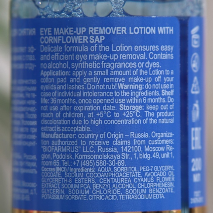- — мягкая формула лосьона позволяет эффективно и бережно снять макияж с глаз, не раздражая слизистую глаз, снижая риск раздражения, покраснений, аллергии и растягивания нежной кожи вокруг глаз