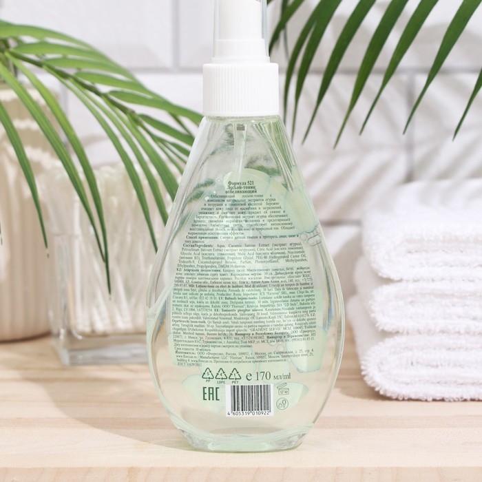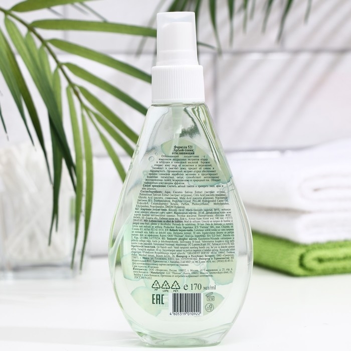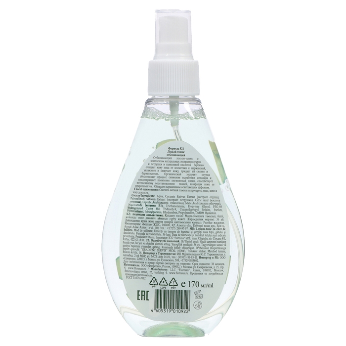 Состав: Aqua, Glycerin, Cucumis Sativus Extract (Экстракт огурца), Petroselinum Sativum Extract (Экстракт петрушки), Citric Acid (Кислота лимонная), Malic Acid (Кислота яблочная), Glycolic Acid (Кислота гликолевая), PEG-40 Hydrogenated Castor Oil, Potassium Hydroxide, Nicotinamide (Витамин В 3), Chamomilla Recutita Extract (Экстракт ромашки аптечная), Bidens Tripartita Flower/Leaf/Stem Extract (Экстракт череды), Parfum, Benzoic.