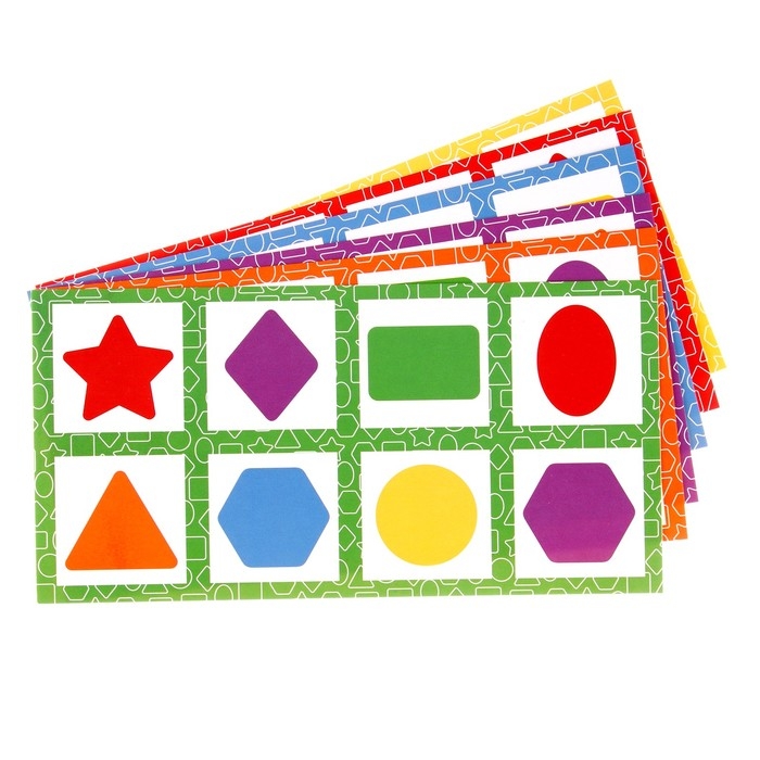 - Картонные карточки — 6 штук. Карточки содержат изображения различных цветов и форм, способствуя развитию визуального восприятия у детей.