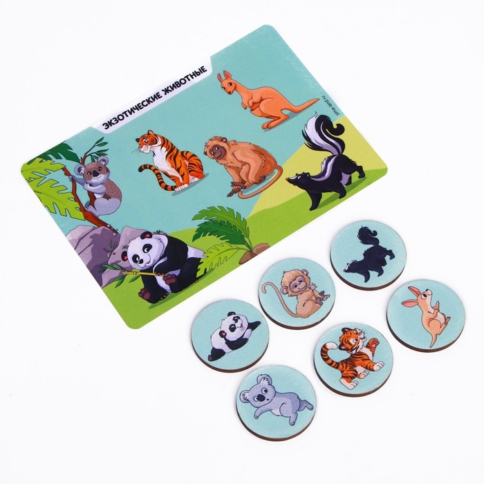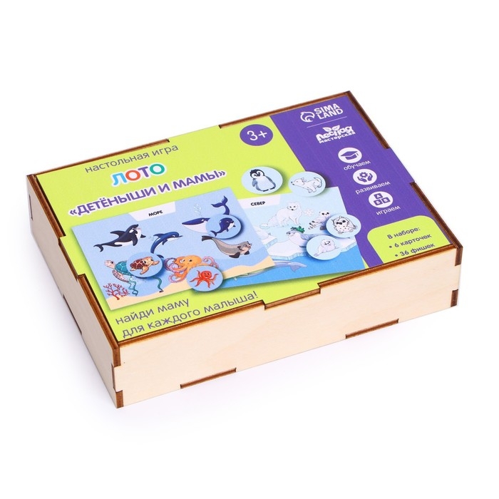 - В набор входят 36 фишек с изображениями детёнышей и 6 карточек с соответствующими взрослыми животными.