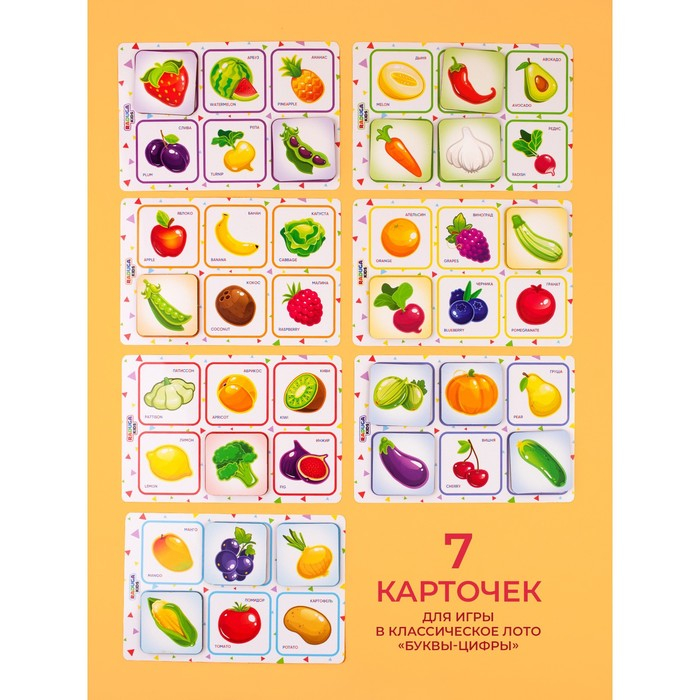 Лото «Фрукты-овощи» — развивающая настольная игра, с помощью которой ребёнок узнает много нового, в том числе то, как пишутся названия продуктов на русском и английском языках.
