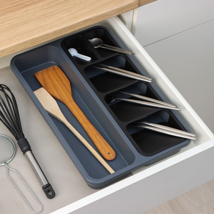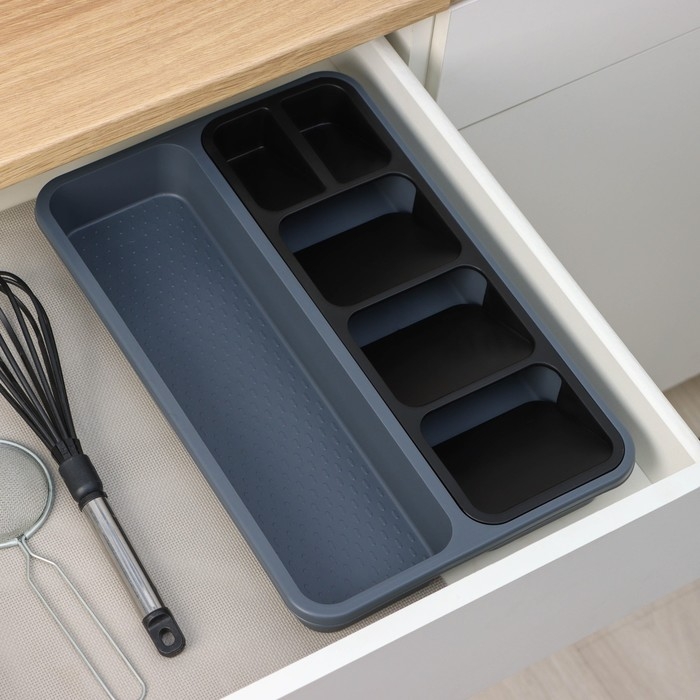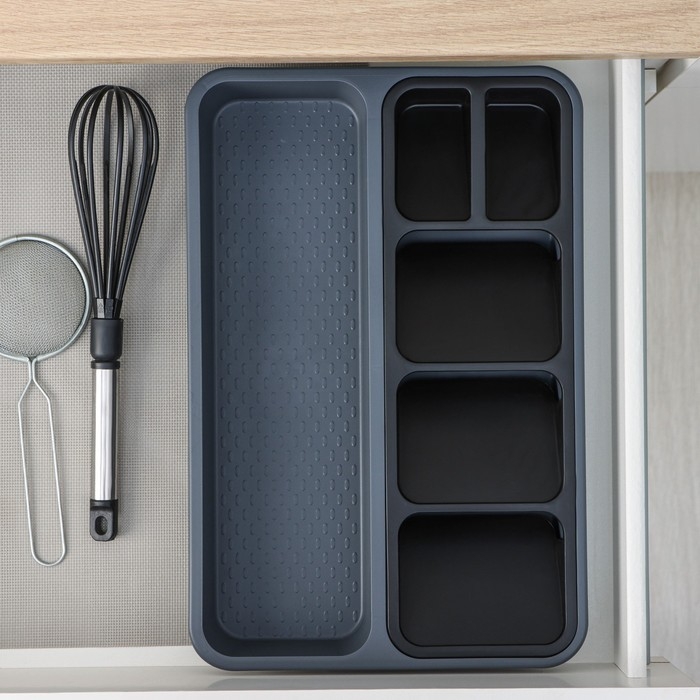 - Разделение лотка на 6 секций поможет вам легко разместить ножи, вилки и другие предметы кухонной утвари отдельно друг от друга.
