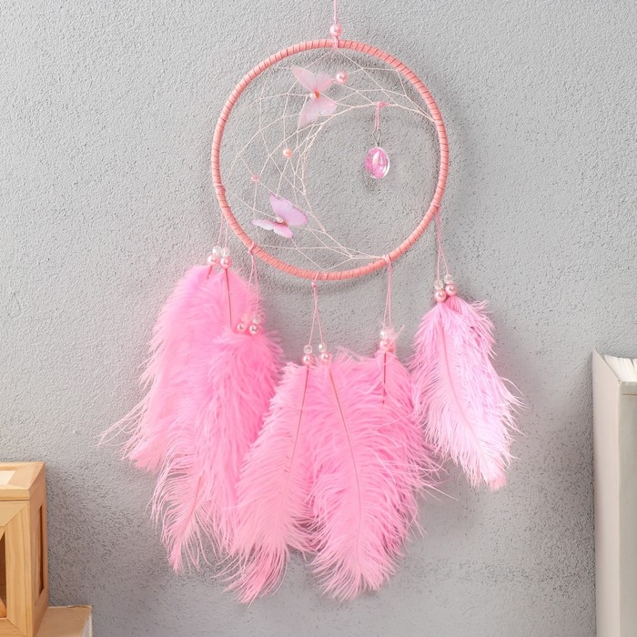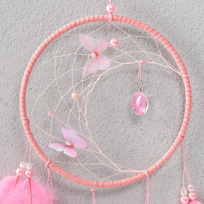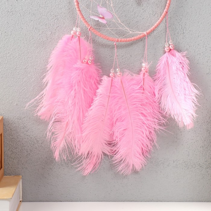 Ловец снов "Бабочки и страусиные перья" розовый d=15 см 50х15 см