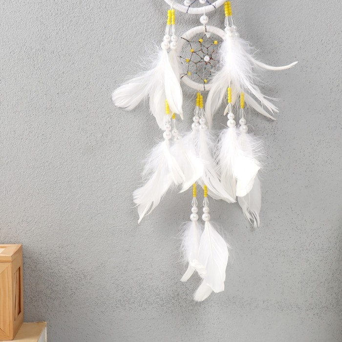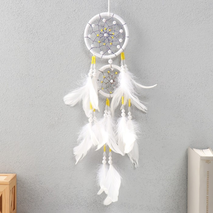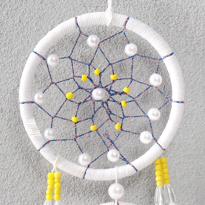 Ловец снов d=10 и 5 см "Паутинка с белыми и желтыми бусинами" белый 50х10х0,7 см