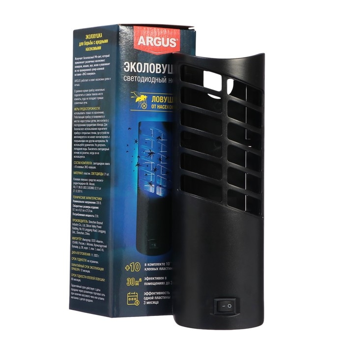 Ловушка специально разработана для использования в жилых помещениях и на террасах. Она эффективно привлекает и уничтожает мух, комаров, дрозофил и других летающих насекомых. При включении прибора в розетку 220В и наступлении темного времени суток, автоматически срабатывает датчик ультра-фиолетового света. УФ свет наиболее привлекателен для большинства насекомых, таких как комары, мошки, мухи, и т. д. Подлетев к лампе, насекомые прилипают к специальной ловушке с клеевой основой , расположенной внутри прибора. Клеевая пластина изготовлена на основе каучуковых смол , без содержания ядов и химикатов, а это очень важно при использовании прибора в детских и спальных комнатах. В отличии от инсектицидных средств борьбы с летающими насекомыми, ARGUS ЭКО ловушка может работать всю ночь и это абсолютно безопасно для Вашего здоровья. Ловушка работает и днем. Для срабатывания датчика УФ света , достаточно лишь немного приглушить дневной свет или подключить прибор в наиболее темном месте в комнате. Главное , чтобы на прибор не попадали прямые солнечные лучи. Сменная клеевая пластина , которая находиться внутри прибора и входит в комплект, рассчитана на 3 месяца защиты или меняется по мере заполнения.