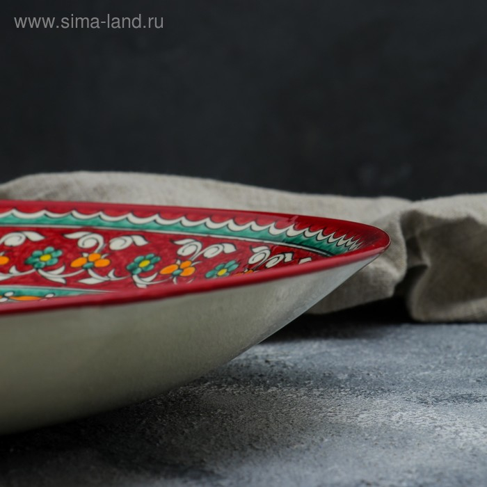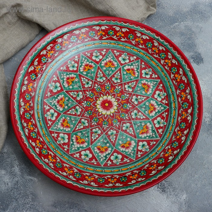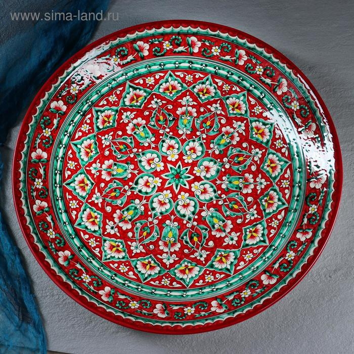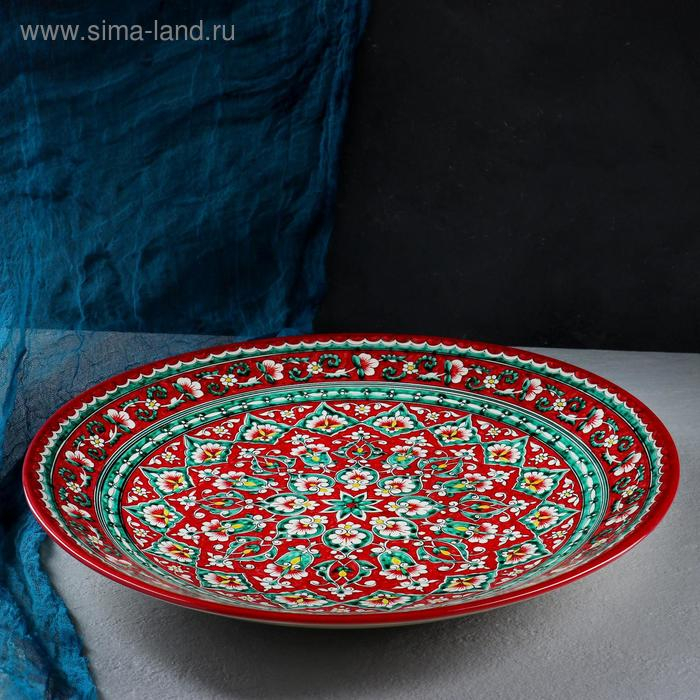 Ляган круглый Риштанская Керамика, 41см, красный, зелёно-жёлтый узор