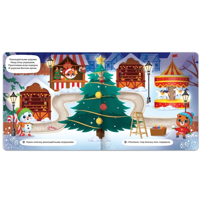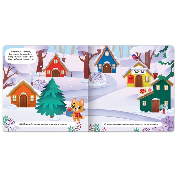 - Внутри ребёнок найдёт задания, которые нужно выполнять, используя магнитные фигурки. Малыш будет крепить их и узнает, как можно украсить ёлочку и дом к празднику.