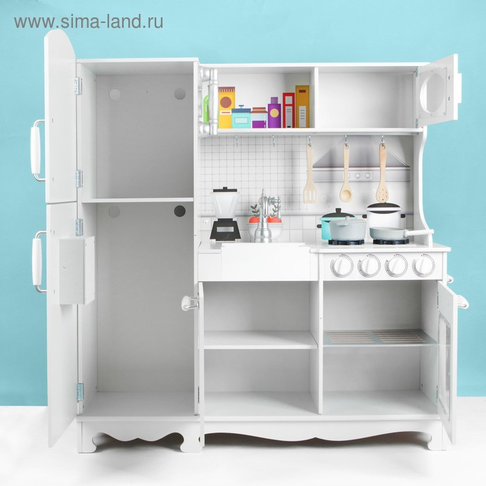 Предметы из комплекта сделаны из экологичного материала — дерева — и покрыты безопасной краской. В гарнитур встроена мойка для посуды. Духовку можно открывать и ставить внутрь пироги или другие блюда.