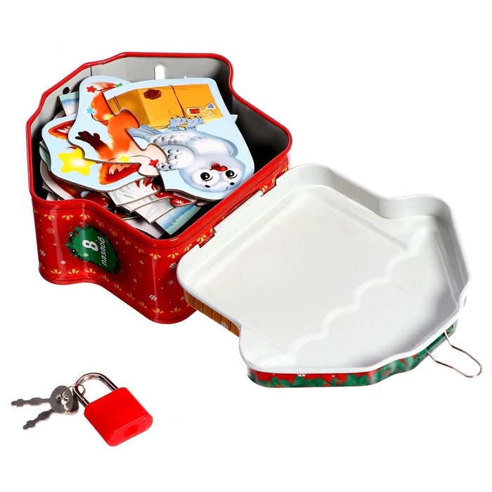 Макси-пазлы в металлической копилке с замочком «Подарки от Деда Мороза», 10 пазлов, 35 деталей