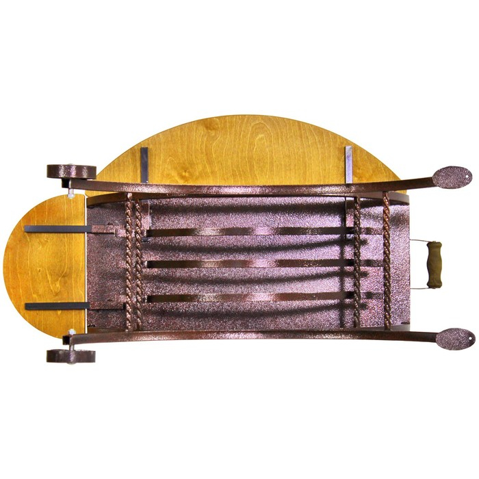 Изготовлен из качественного стального профиля, листовой стали и фанера березовая. Для защиты от неблагоприятного воздействия внешней среды используется порошковая краска. Деревянные детали обработаны антисептической пропиткой и покрыты лаком.