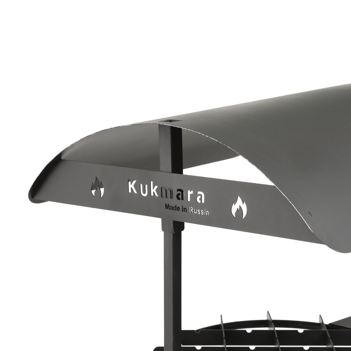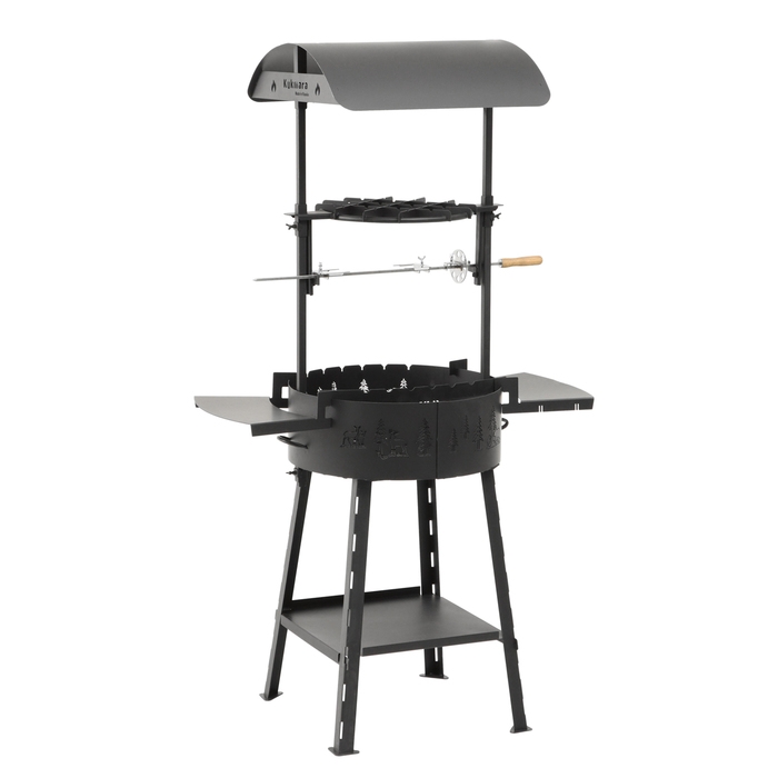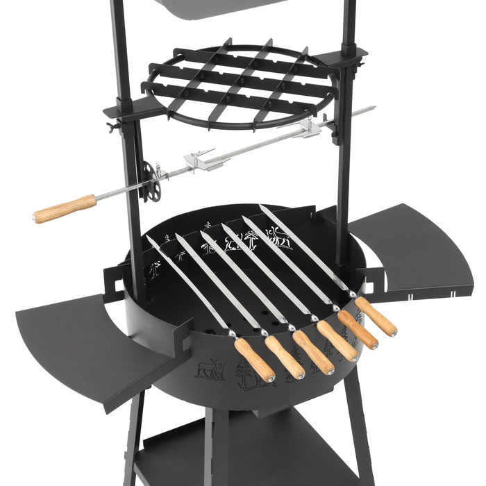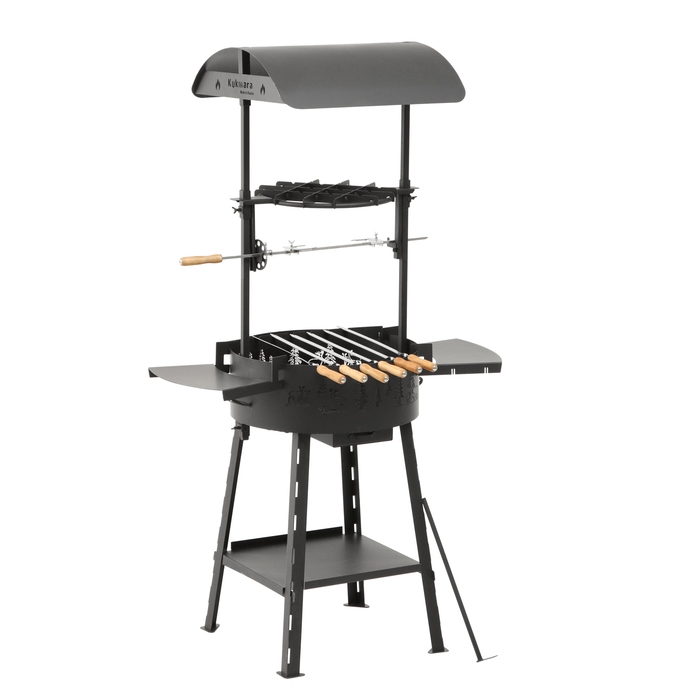 На данной печи можно запечь продукт с использованием вертела (входит в комплект). Крыша защищает угли и блюда от дождя. Съемные столики обеспечивают комфорт при приготовлении. Температура нагрева печи регулируется путем выдвижения зольного ящика, расположенного внизу под жаровней.