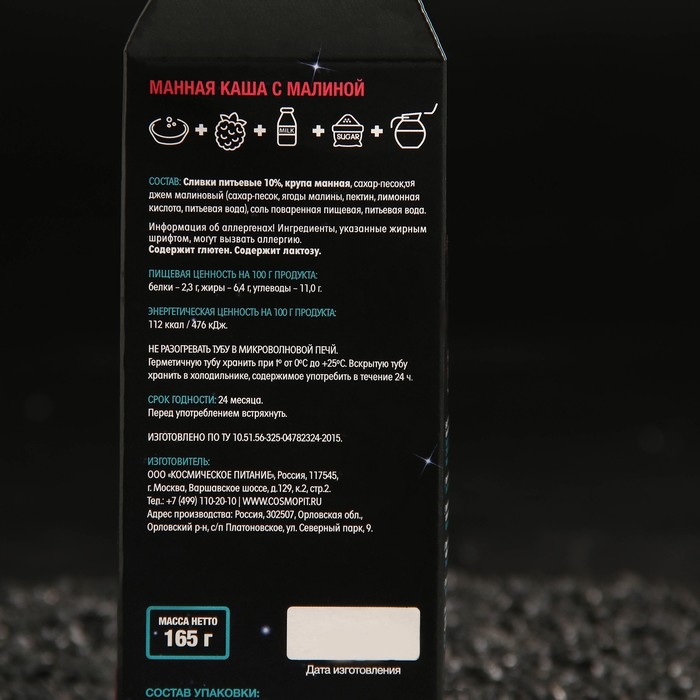 Космический продукт манная каша с малиной— это уникальный продукт, созданный с учетом самых высоких стандартов питания, необходимых как для обычной, так и для жизни в условиях космоса. Эта каша сочетает в себе питательность и вкус, предлагая астрономам и исследователям на борту космических станций легкий и сытный завтрак.