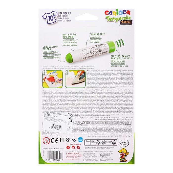 "Carioca" "Temperello Fabric" 42324 Карандаши-стики для ткани и трикотажа. После высыхания - фиксация утюгом 3-4 минуты с изнаночной стороны через лист бумаги. Несмываемые, стирка до 60°С.
