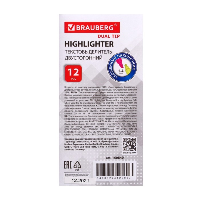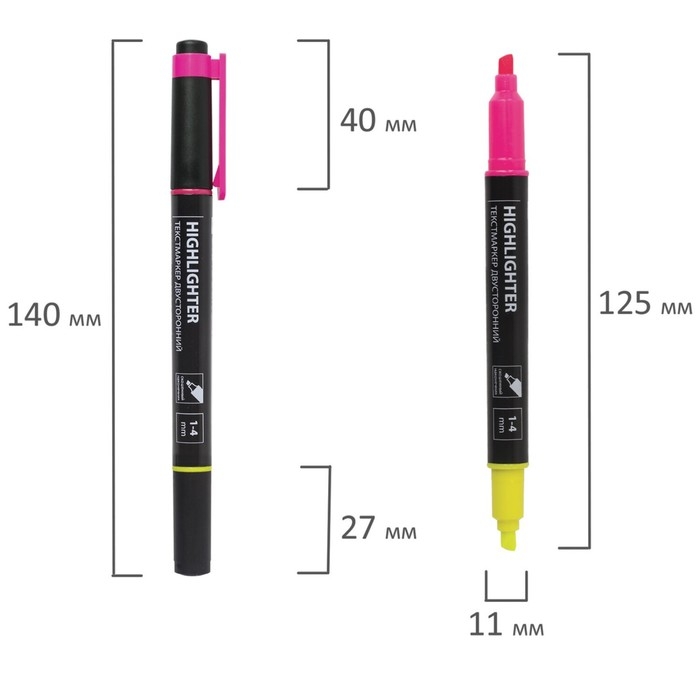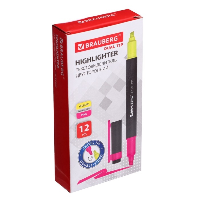 Маркер-текстовыделитель двусторонний 4 мм, BRAUBERG, лимонный/розовый