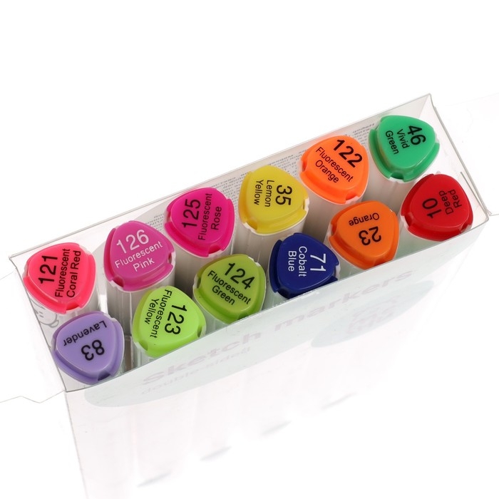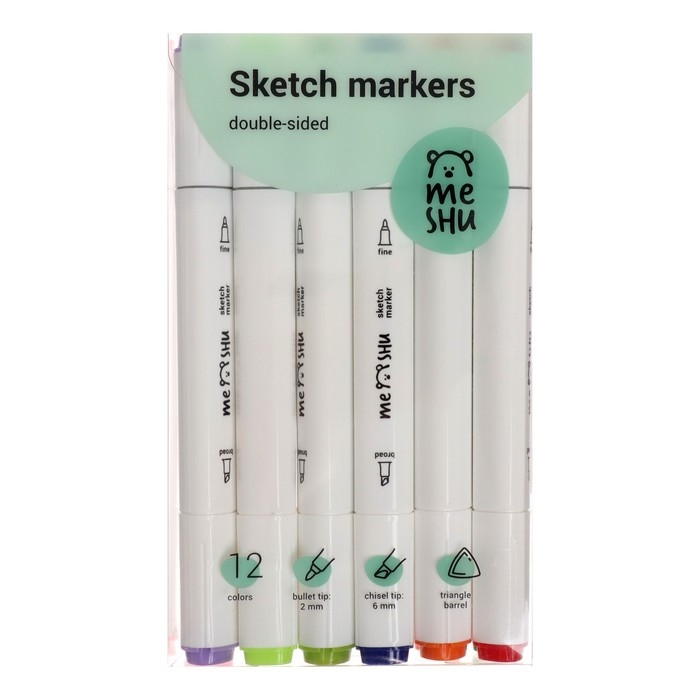 Маркеры для скетчинга двусторонние MESHU, 12 цветов (основные и флуоресцентные цвета), трехгранный корпус