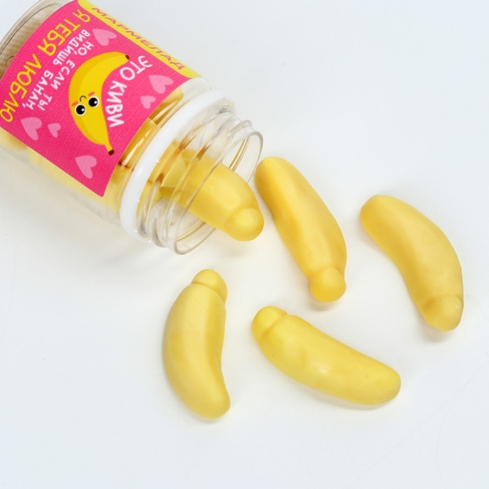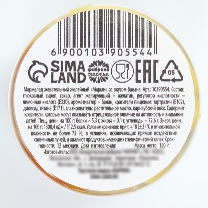 Состав: глюкозный сироп, сахар,агент желирующий - регулятор кислотности - лимонная кислота (Е330), ароматизатор - банан, красители пищевые: тартразин (Е102), диоксид титана (Е171), глазирователь: растительное масло, каранубский воск.