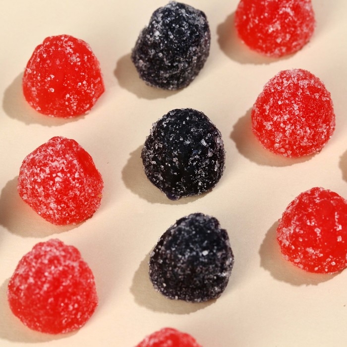 Состав: глюкозный сироп, сахар, агент желирующий – желатин, регулятор кислотности – лимонная кислота (Е330), молочная кислота (Е270), ароматизаторы: малина, ежевика, барбарис, красители пищевые: кармуазин (Е122), понсо 4R (Е124), индигокармин (Е132), черный блестящий PN (Е151), глазирователь: растительное масло, карнаубский воск.
