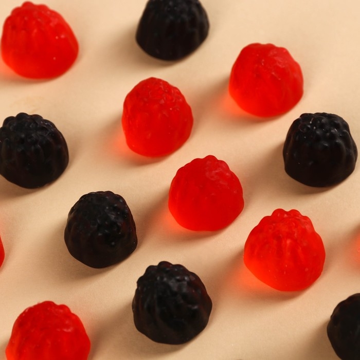 Состав: глюкозный сироп; сахар; агент желирующий: желатин; регулятор кислотности: лимонная кислота (Е330); ароматизаторы: малина, ежевика, барбарис; красители пищевые: кармуазин (Е122), понсо 4R (Е124),индигокармин (Е132), черный блестящий PN (Е151); глазирователь: растительное масло, карнаубский воск.