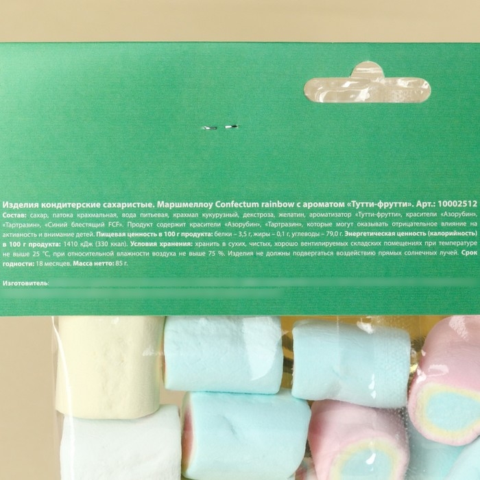 Состав: сахар, патока крахмальная, вода питьевая, крахмал кукурузный, декстроза, желатин, ароматизатор "Тутти-фрутти", красители "Азорубин", "Тартразин", "Синий блестящий FCF".