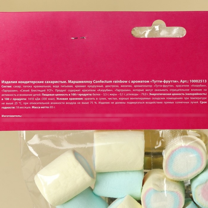 Состав: сахар, патока крахмальная, вода питьевая, крахмал кукурузный, декстроза, желатин, ароматизатор "Тутти-фрутти", красители "Азорубин", "Тартразин", "Синий блестящий FCF".