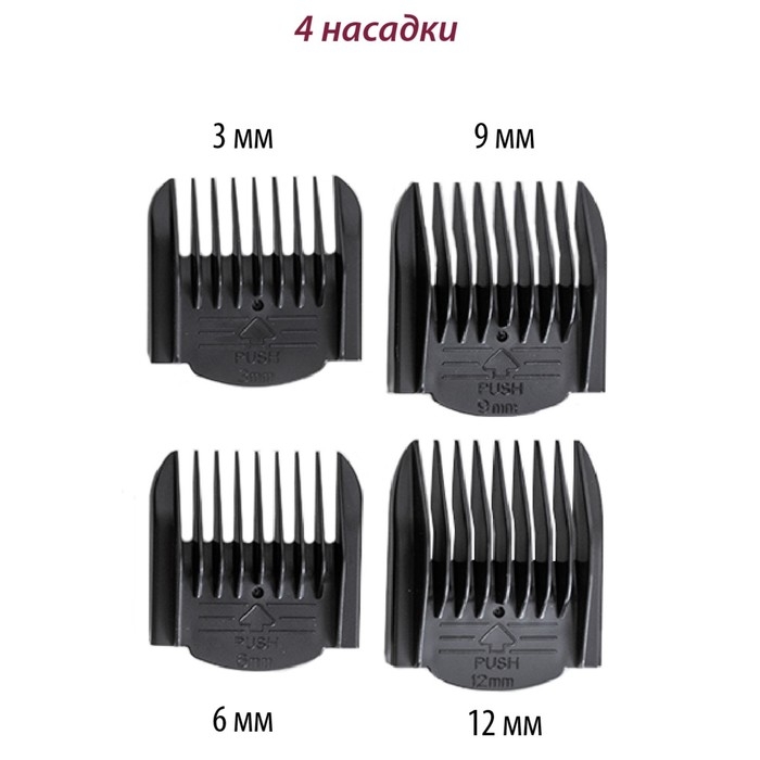 - Насадки: 4 съемные регулируемые насадки 3 мм, 6 мм, 9 мм, 12 мм