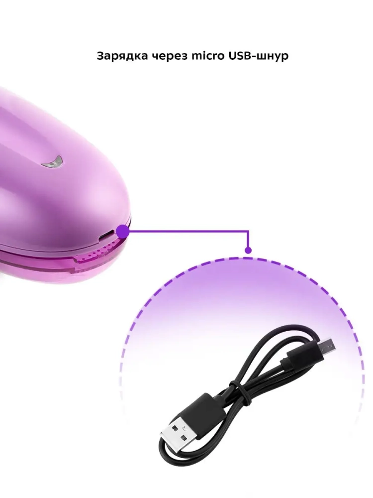 Прибор работает от встроенного аккумулятора. Заряжать очиститель катышков с помощью micro USB-шнура можно от компьютера или через переходник от розетки, который наверняка окажется у вас дома.