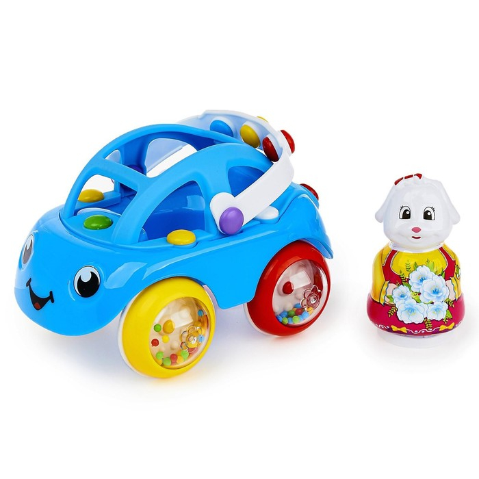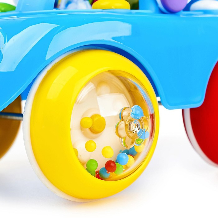 В кабине машинки «Пышка» находится забавный пассажир-зверюшка. Ребёнок сможет легко достать его и играть с ним, что добавит интереса и веселья. Колёса машинки наполнены маленькими разноцветными шариками, которые пересыпаются и привлекают малыша приятным звучанием.