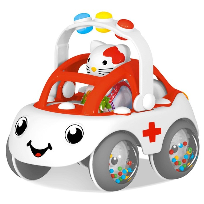Колёса машинки заполнены маленькими разноцветными шариками, которые пересыпаются и привлекают малыша приятным звучанием. Кабина машинки выполнена из приятного мягкого материала, который легко моется и полностью безопасен для маленьких непосед.