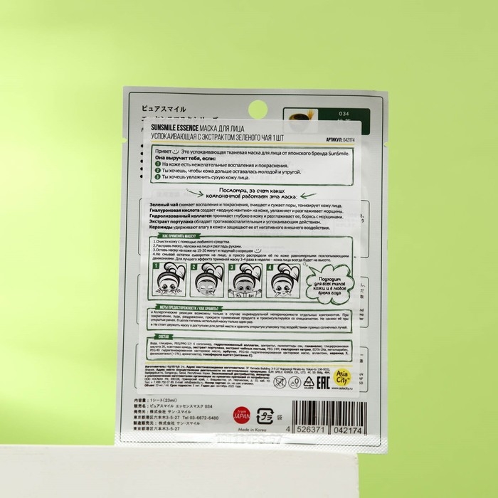 Маска для лица SUNSMILE Essence «Успокаивающая», с экстрактом зелёного чая, 1 шт.