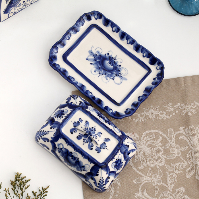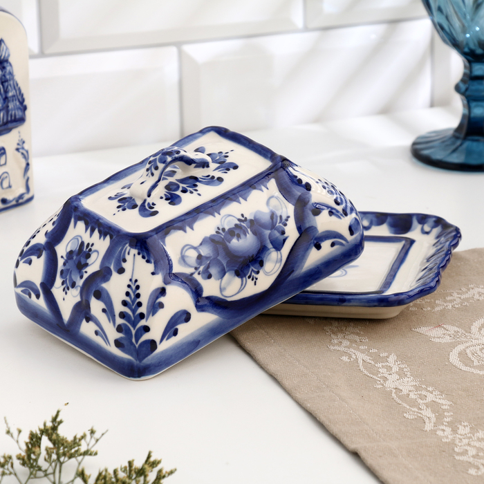 Масленка прямоугольная, гжель, фарфор, 12х18 см