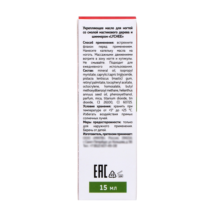 Качественный уход, лёгкое мерцание и сладкий аромат личи. Для ломких, повреждённых ногтей и сухой кутикулы. Укрепляет, питает, восстанавливает ногти и смягчает кутикулу. Содержит витамины А и Е. Смола мастикового дерева в составе масла увеличивает толщину ногтей и повышает их прочность при ежедневном использовании в течение 1 месяца.