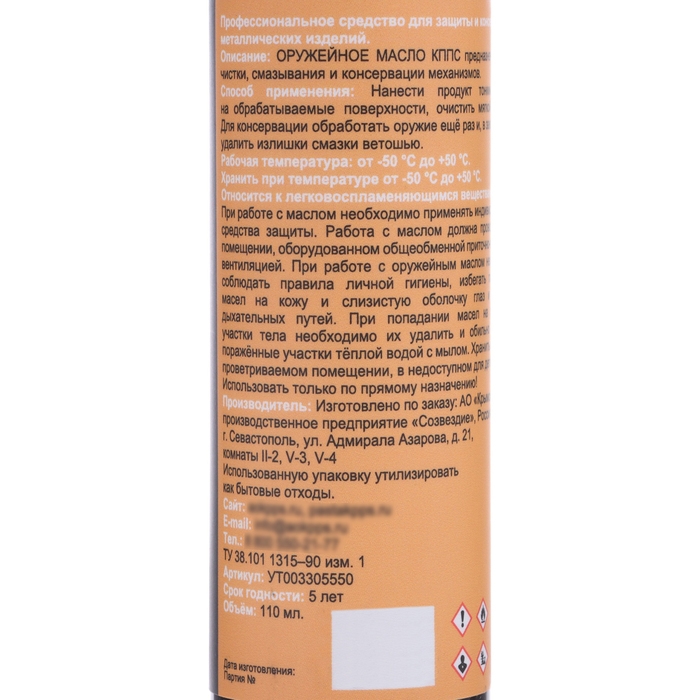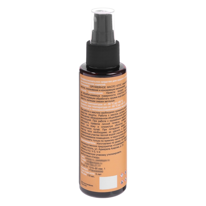 Оружейное масло КППС — это нейтральное средство для консервации и чистки гладкоствольного, нарезного, огнестрельного, газового и пневматического оружия. Защитная способность масла сохраняется до −50 °C. Оно безопасно для дерева, резины, металла и лакокрасочного покрытия. Масло обладает высокой проникающей способностью, снижает коэффициент трения и защищает металл от коррозии при длительном хранении. Объём продукта — 110 мл.