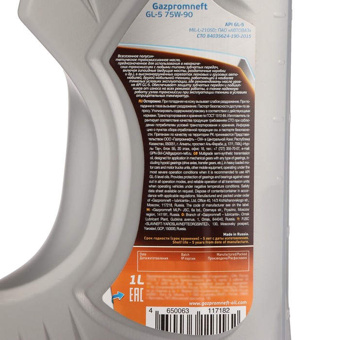 Масло трансмиссионное Gazpromneft GL-5 75W-90, полусинтетическое, 1 л
