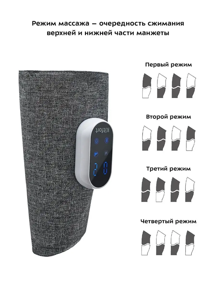 KT-2952 — устройство для проведения лимфодренажного массажа ног. С помощью массажера Kitfort КТ-2952 можно сделать массаж икроножных мышц, не прибегая к посторонней помощи. Прибор сочетает в себе воздушно-компрессионный массаж, вибрацию и нагрев в области икроножных мышц. Вы можете включить массаж, массаж с вибрацией/нагревом или массаж с вибрацией и нагревом.