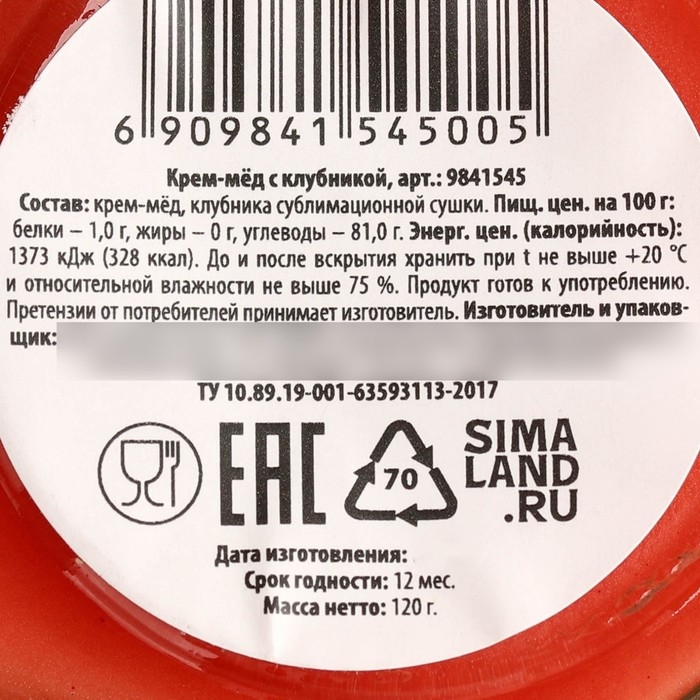 Состав: крем-мёд, клубника сублимированной сушки.