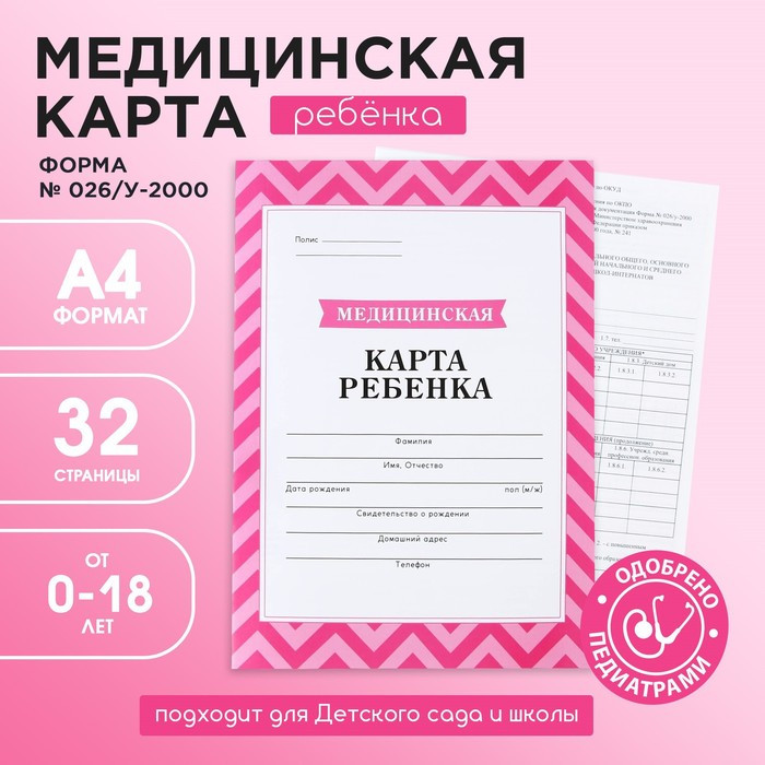 Медицинская карта, формат А4, 16 листов. Форма № 026/у-2000 «Розовый»