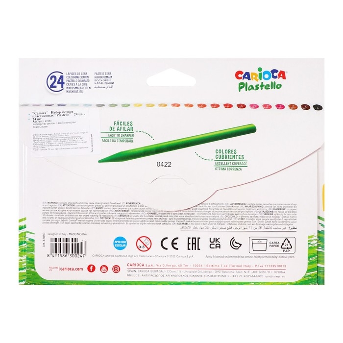 Мелки пластиковые 24 цвета, Carioca "Plastello", яркие цвета, экономичный расход, не пачкаются, круглые, в конверте