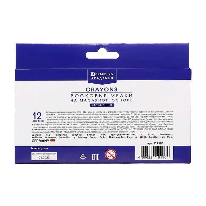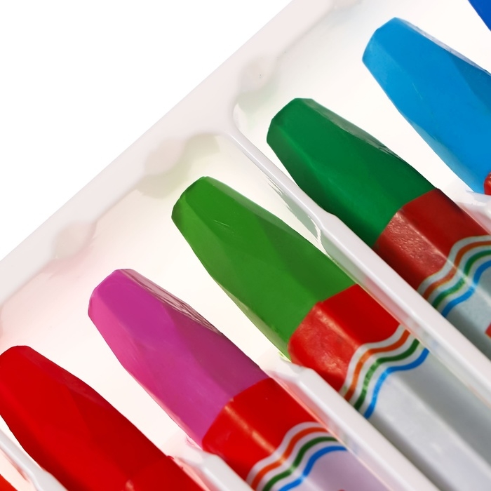 Палитра состоит из 12 ярких и насыщенных цветов. Полностью безопасны в использовании, не токсичны и не имеют резкого запаха. Благодаря своему составу карандаши пишут мягко, и ребенку не придется прикладывать усилия в процессе рисования. Утолщенная шестигранная форма корпуса и диаметр 11 мм делают их еще более удобными для тренировки руки к письму у дошкольников и детей младшего школьного возраста, формируют навык правильного захвата, снижают нагрузку на кисти рук, отлично развивают мелкую моторику. Каждый мелок завернут в бумажную гильзу, которая позволяет не пачкать руки, снижает скольжение, увеличивает прочность мелка. Восковые карандаши упакованы в картонную коробку с европодвесом.
