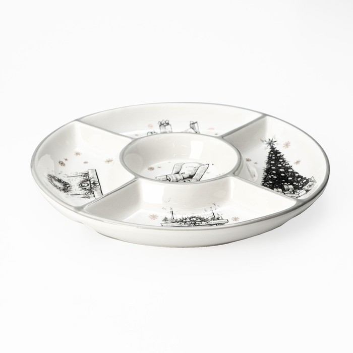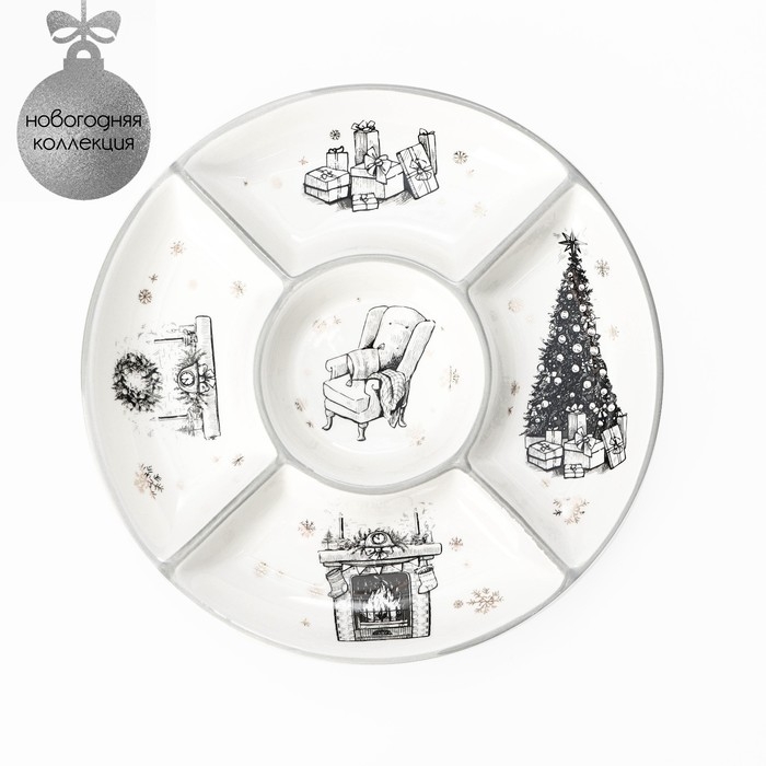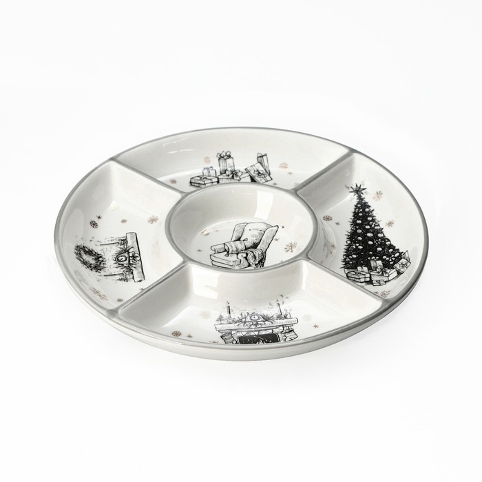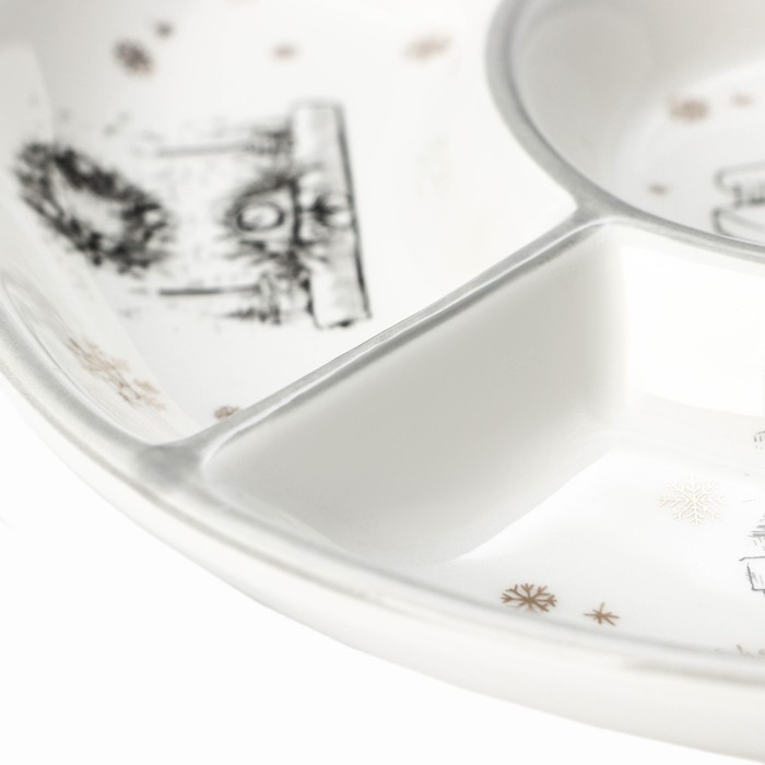 Менажница впишется в интерьер любой кухни и позволит интересно сервировать стол. Новогодняя тарелка для закусок подойдёт для проведения теплого, уютного праздника в кругу семьи и близких друзей. Изделие имеет две ячейки, в которые можно положить нарезку сыра, фрукты, мясные деликатесы, орехи, конфеты и другие закуски.