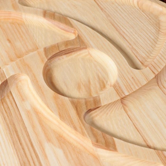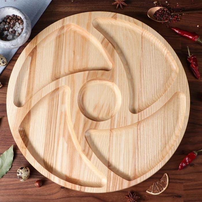 Деревянная менажница имеет свой уникальный стиль и красоту. Она изготовлена из натурального дерева, что придает ей шарм и теплоту.