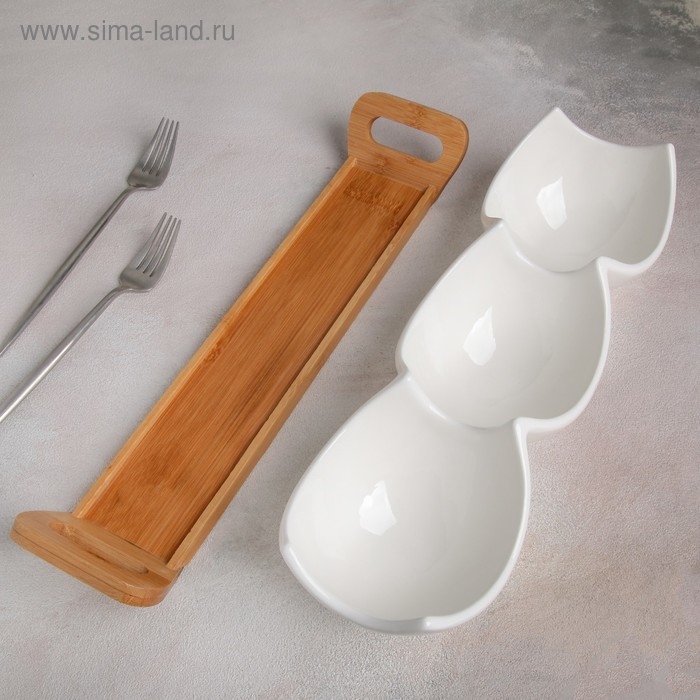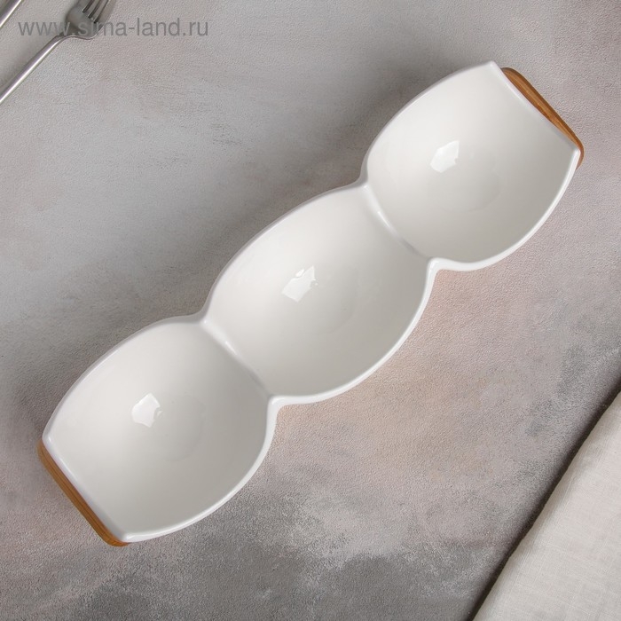Менажница керамическая 3 ячейки на деревянной подставке «Эстет», 39,8×11,4 см, цвет белый