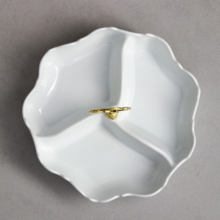 Менажница из фарфора впишется в интерьер любой кухни и позволит интересно сервировать стол. Тарелка для закусок подойдёт для проведения вечеринок или домашних посиделок с близкими. Стильная посуда имеет несколько ячеек, в каждую из которых можно положить нарезку сыра, фрукты, мясные деликатесы, орехи, конфеты и прочие продукты.