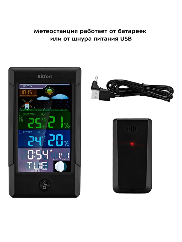 Метеостанция Kitfort KT-3322 — это прибор, который позволит следить за показаниями температуры и влажности в помещении и на улице, фазой луны, погодой, атмосферным давлением. Устройство прогнозирует погодные условия на ближайшие 12–24 часа на основе изменения атмосферного давления. Также KT-3322 показывает время, дату, день недели и может служить будильником. Сигнал будильника можно отложить на 10 минут. Метеостанция показывает тенденцию изменения температуры и влажности: повышение, понижение, без изменений. У данного устройства цветной экран, на котором хорошо видны все необходимые значения. Подсветка имеет 3 уровня яркости. Метеостанция может работать как через USB-шнур (входит в комплект), подключенный к компьютеру или пауэрбанку, так и от 3 щелочных батареек типа AA (не входят в комплект), благодаря чему ее можно расположить в любом удобном для вас месте. Благодаря широкому основанию, метеостанция устойчиво стоит на столе. Данная модель оснащена одним датчиком, у которого есть отверстие для настенного крепления, чтобы получать показания температуры и влажности снаружи помещения. Вы можете поместить датчик не на улице, а в другом помещении, но в этом случае прогноз погоды не сможет быть произведен. Питание датчика происходит от 2 щелочных батареек типа AAA (не входят в комплект). Благодаря стильному дизайну и компактному размеру метеостанция легко впишется в ваш интерьер.