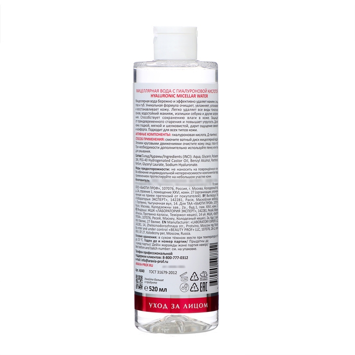 Мицеллярная вода ARAVIA Laboratories с гиалуроновой кислотой, 520 мл
