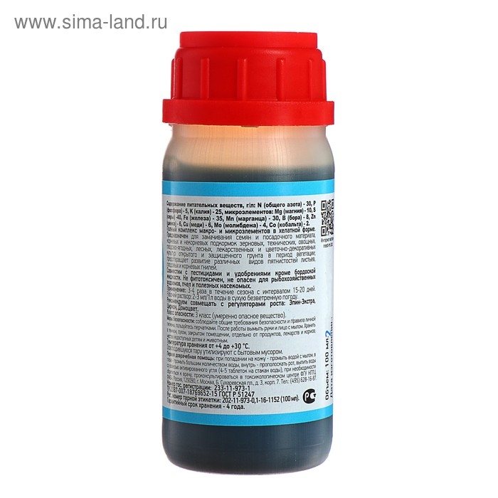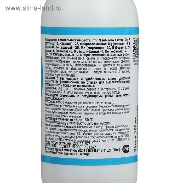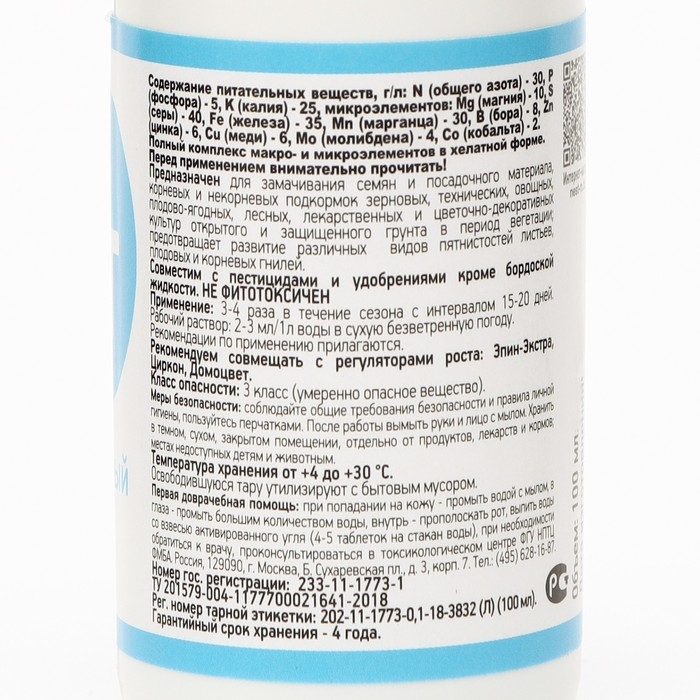 Состав: общий азот, фосфор, калий, магний, сера, железо, марганец, бор, цинк, медь, молибден, кобальт.